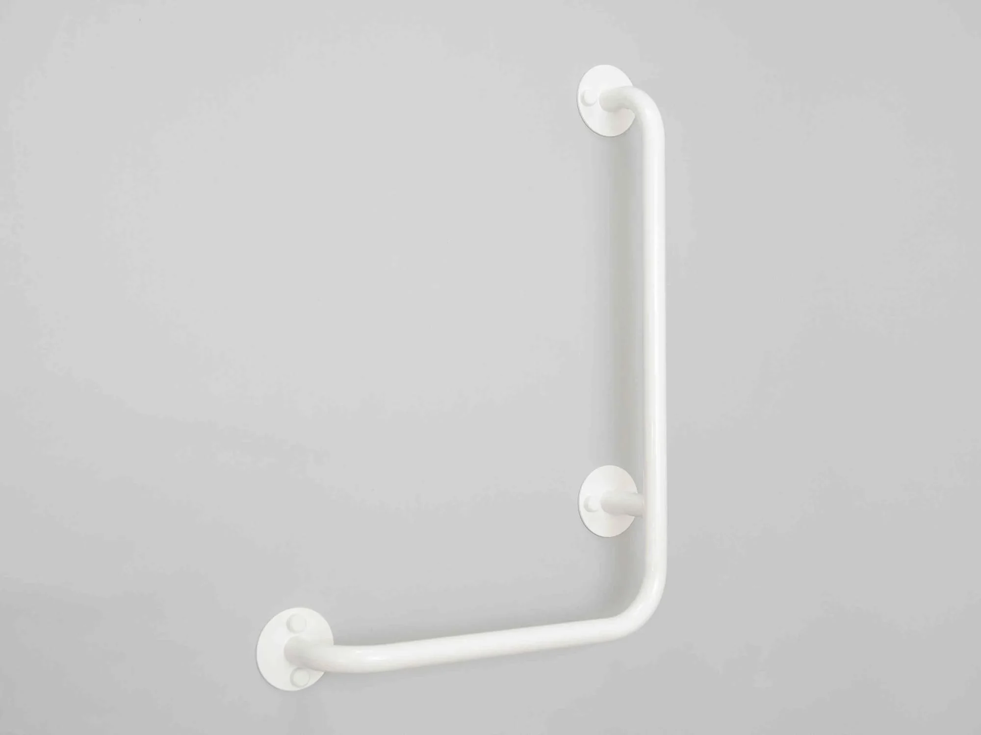 Bezpečnostní lomené madlo ve tvaru 'L' pro sprchy a vany, ideální pro zvýšení stability a prevence pádů během sprchování či vstávání. Vyrobené z odolného materiálu s průměrem 25 mm, nabízí pevné a stabilní uchopení.
