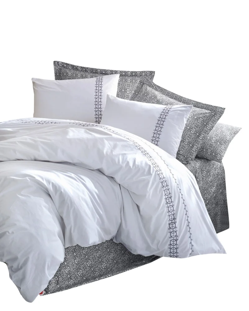 Objevte dokonalé pohodlí s naší ložní soupravou NN00333 vyrobenou z 100% bavlna akfil. Sada obsahuje povlečení na přikrývku o rozměrech 200×220 cm, prostěradlo 240×260 cm a povlaky na polštáře 50×70 cm (2 kusy), doplněné o povlaky Oxford 50×70 cm (2 kusy) a zapínání na knoflíky. Design kombinuje šedou a bílou barvu v nadčasovém vzoru s reaktivním potiskem, který zůstává jasný i při častém praní. Ranforceová tkanina zajišťuje hebký dotek a pohodlné spaní. Snadná údržba: lze prát na 40 °C v pračce, což usnadňuje každodenní péči a prodlužuje životnost soupravy. Díky elegantnímu pojetí se sada hodí k různým stylům ložnic a okamžitě dodá prostoru klid a luxus. Objednejte si ji ještě dnes a dopřejte si komfort, který si zasloužíte.