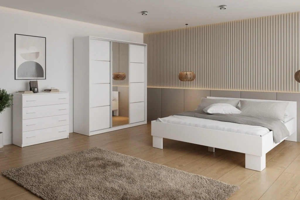 Postel se dodává bez roštu a matrace; vhodný rozměr matrace je 180 x 200 cm, případně dva kusy 90 x 200 cm. Ozdobné lišty na dveřích skříně není nutné instalovat, díky čemuž vzniknou hladké dveře bez lišt a čistý vzhled ložnicového prostoru. Dodáváno v demontu.