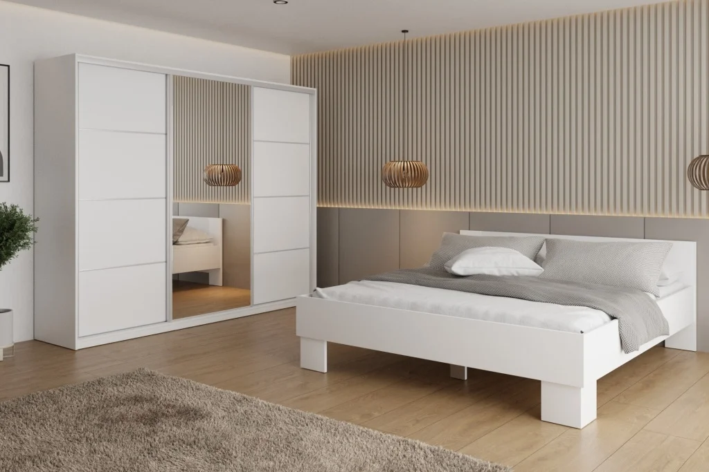 Ložnice Barnaba 250 v bílé variantě spojuje svěží vzhled s praktickými řešeními pro moderní ložnici. Nábytek je vyroben z lamina s melaminovou hranou a využívá pohodlné rolničkové výsuvy. Sestavu tvoří šatní skříň s posuvnými dveřmi o rozměrech 250 x 205 x 56,3 cm, postel 180 x 200 cm a doplňkový díl 185 x 75,5 x 204 cm. Postel je dodávána bez roštu a matrace; pro lůžko 180 x 200 cm je doporučena standardní matrace, případně lze použít dva kusy 90 x 200 cm. Ozdobné lišty na dveřích skříně nejsou nutné instalovat, což umožňuje mít hladké dveře bez lišt. Dodáváno v demontu. Díky světlému odstínu se nábytek skvěle hodí k různým stylům doplňků a prostor opticky rozjasní. Snadná montáž a variabilita uspořádání umožní přizpůsobit ložnici vašim potřebám.