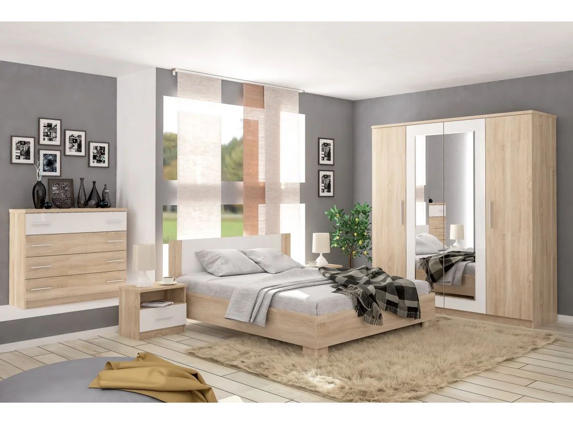 Ložnicová sestava KABIR 1 je modulární systém, který si snadno poskládáte dle prostoru a požadavků. V ukázkové konfiguraci obsahuje šatní skříň, komodu a dva noční stolky spolu s postelí o ložné ploše 160x200 cm; rám postele má rozměry 166x204x85 cm a postel je dodávána s roštem. Matraci je potřeba dokoupit, vhodná volba je 160x200 cm, nebo dva kusy 80x200 cm. Provedení v barevném provedení dub sonoma/bílá vychází z LTD lamina s plastovými úchyty. Dodání probíhá v demontu a na zboží se vztahuje záruka 24 měsíců. Díky svěžímu kontrastu a jednoduchému designu se hodí do moderní i klasické ložnice a modulárnost vám umožní sestavu přizpůsobit na míru prostoru a vkusu.