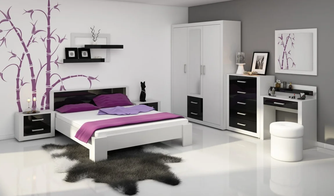 Ložnice MOLTENO kombinuje bílé provedení s černým leskem, čímž vzniká moderní a svěží vzhled interiéru. Součástí sestavy je šatní skříň (165 × 209 × 58 cm), komoda (80 × 106 × 42 cm), toaletní stolek (80 × 94 × 42 cm), zrcadlo (80 × 74 × 2 cm), velká police (120 × 55 × 19 cm) a dva noční stolky (59 × 44 × 35 cm); dále postel (207 × 76 × 166 cm) s ložnou plochou 160 × 200 cm (rošt a matrace nejsou součástí balení).