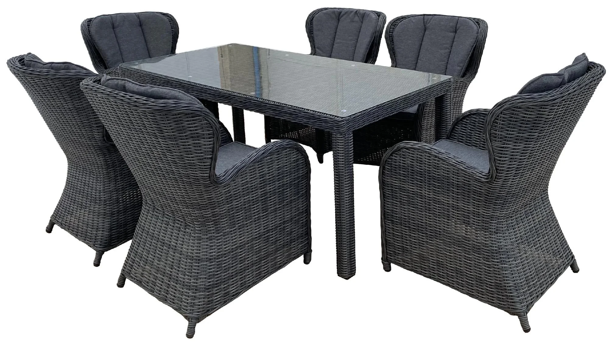 Tento exkluzivní set zahrnuje 6 pohodlných židlí a prostorný stůl s vrchní deskou z tvrzeného skla o tloušťce 5 mm. Nabízí se v elegantní antracitové barvě doplněné šedými polstry. Výrobek je navržen z ručně proplétaného umělého ratanu, který se snadno udržuje a je odolný vůči vlivům počasí, včetně UV záření a teplot od -10 až do 50 °C. Díky lehké hliníkové konstrukci, která je odolná proti korozi, můžete tento nábytek využívat po celý rok. Zadní opěrky s polstrováním přispívají k ještě většímu pohodlí. Konstrukce je svařená pro dlouhou životnost a není třeba ji montovat - po doručení můžete ihned začít používat. Ideální volba pro stylové a praktické zahradní posezení.