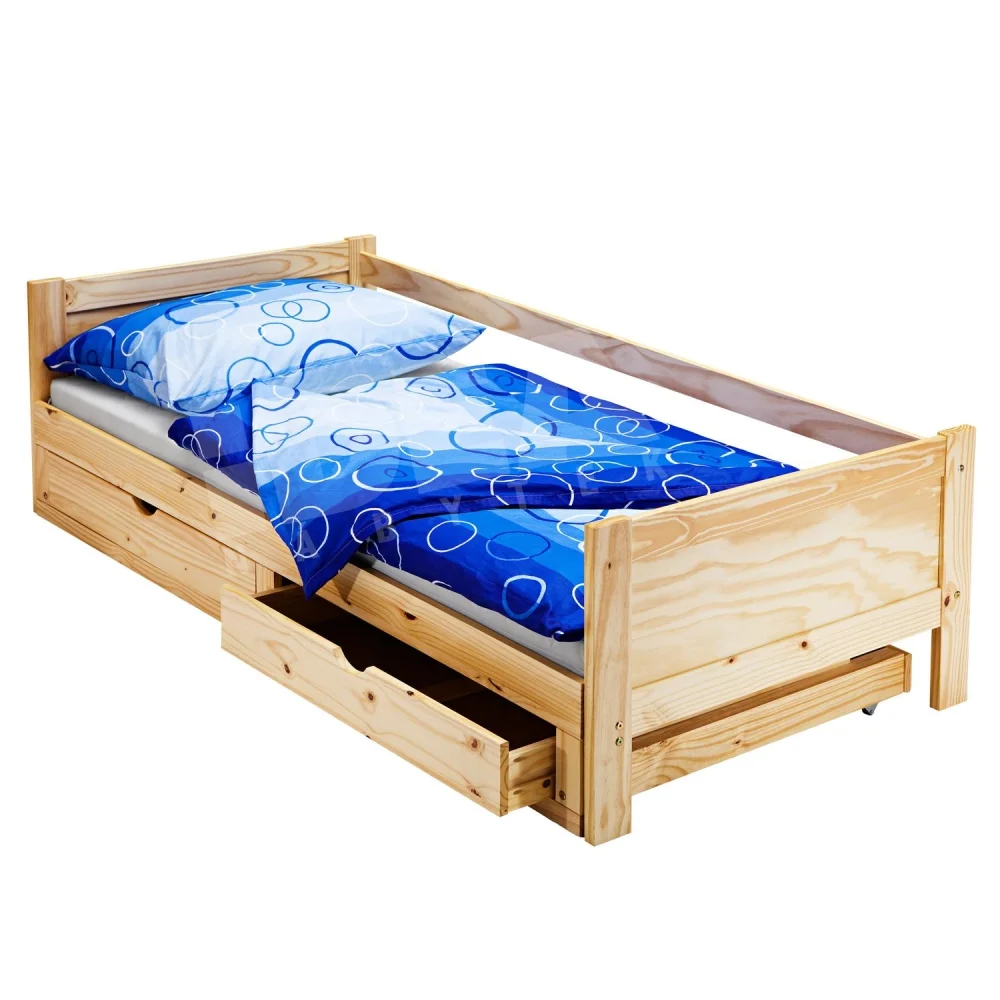 Víceúčelové lůžko z masivní borovice je lakované a kombinuje praktickou eleganci s dlouhou životností. Při rozložení se snadno promění ve dvoulůžko 180 × 200 cm, zatímco výška sedu zůstává 38 cm pro pohodlné sezení. Součástí balení jsou rošty; matrace se dodávají zvlášť a doporučený rozměr matrace je 90 × 200 cm. Rozměry celé soustavy činí 205 × 101 × 62 cm a balení obsahuje dvě krabice pro lepší přepravu. Díky promyšlenému designu je vhodné do dětského pokoje i do ložnice pro hosty; nižší čelo chrání proti studené stěně a lze na bok umístit čalouněný válec, který během dne poslouží jako pohodlná pohovka. Pod postelí se skrývají dvě praktické zásuvky pro ukládání peřin a polštářů, čímž ušetříte místo. Lůžko z masivu borovice slibuje stabilitu a dlouhou životnost, která vydrží i při proměnlivém využití např. studentskými víkendy.