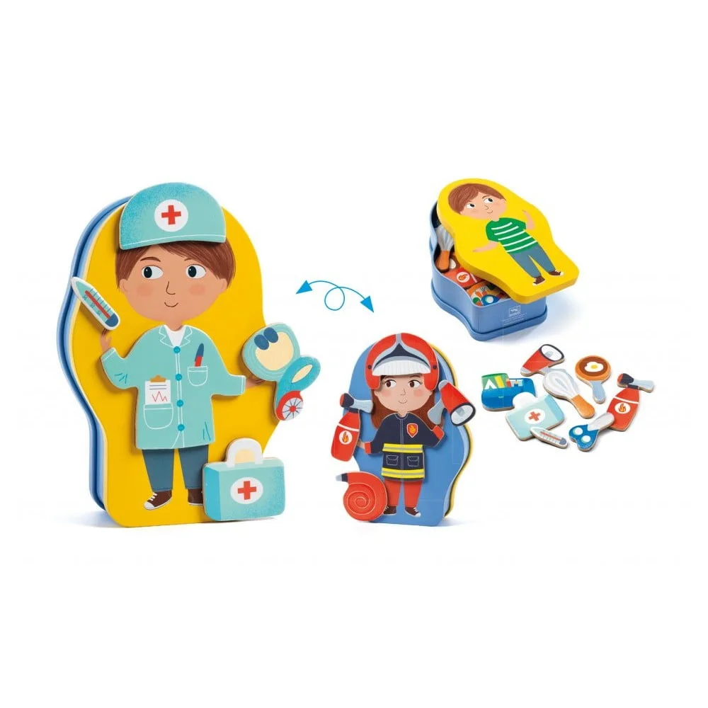 Magnetická hra Djeco je skvělou zábavou pro malé nadšence do různých profesí. Plechové víko s magnetickou fólií na obou stranách umožňuje dětem kreativně sestavovat různé pracovní role z 20 dílků, které jsou součástí balení.