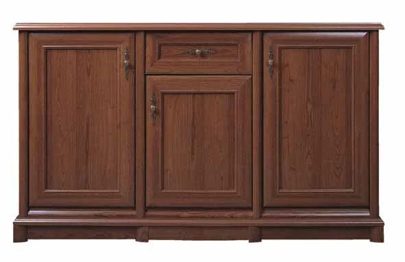 Komoda s třídveřovým provedením a jednou zásuvkou nabízí praktický úložný prostor. Rozměry: výška 90,5 cm, šířka 153,5 cm a hloubka 45 cm. V provedení kaštanová barva působí elegantně a doplňuje klasický styl díky ozdobným detailům, soklům a jemným úchytům.