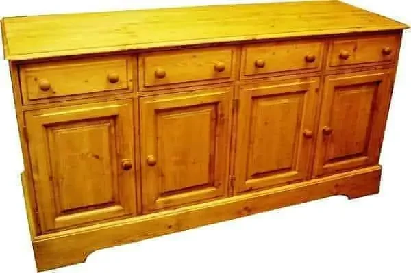 Příborník je vyroben z masivního smrkového dřeva, s možností volby provedení i v borovicovém masivu. Z masivu jsou vyrobeny i zadní stěna a police, což zajišťuje vysokou pevnost a stabilitu. Tento kus nabízí praktickou konfiguraci úložného prostoru: čtyři dveře, jedna police a čtyři zásuvky bez pojezdů (lze objednat s pojezdy). Povrchová úprava spočívá v dekorativním vosku Osmo Color, který zdůrazní kresbu dřeva a zároveň odpuzuje vodu i nečistoty; vosk neobsahuje konzervační látky a je zdravotně nezávadný. K dispozici je také varianta bez finální úpravy pro vlastní úpravy, případně možnost vnitřního povrchového zpracování za 4% příplatek. Masivní provedení dodává komodě nadčasový vzhled a dlouhou životnost, která ocení každá domácnost.