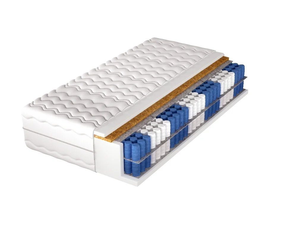 Hypoalergenní oboustranná matrace s taštičkovými pružinami o rozměrech 200 × 200 cm nabízí vyváženou oporu a komfort. Jádro tvoří dvě vrstvy taštičkových pružin s 7 zónami tvrdosti a celkovou hustotou 262 pružin na m².