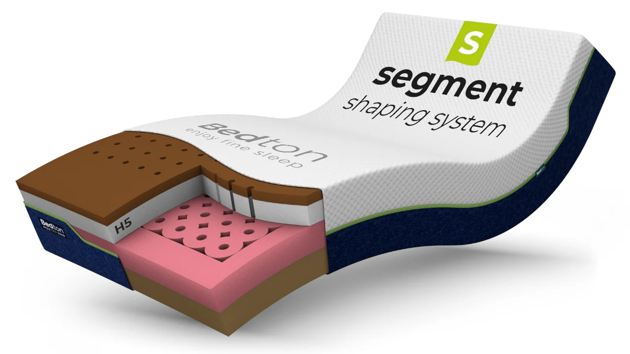 Jádro tvoří perforovaná paměťová pěna CARPENTER® o objemové hmotnosti 85 kg/m³ a perforovaná studená pěna CARPENTER® 50 kg/m³, doplněné horní vrstvou XDURA® z německé studené pěny o 50 kg/m³ pro lepší odvětrávání a tvarovou stabilitu.