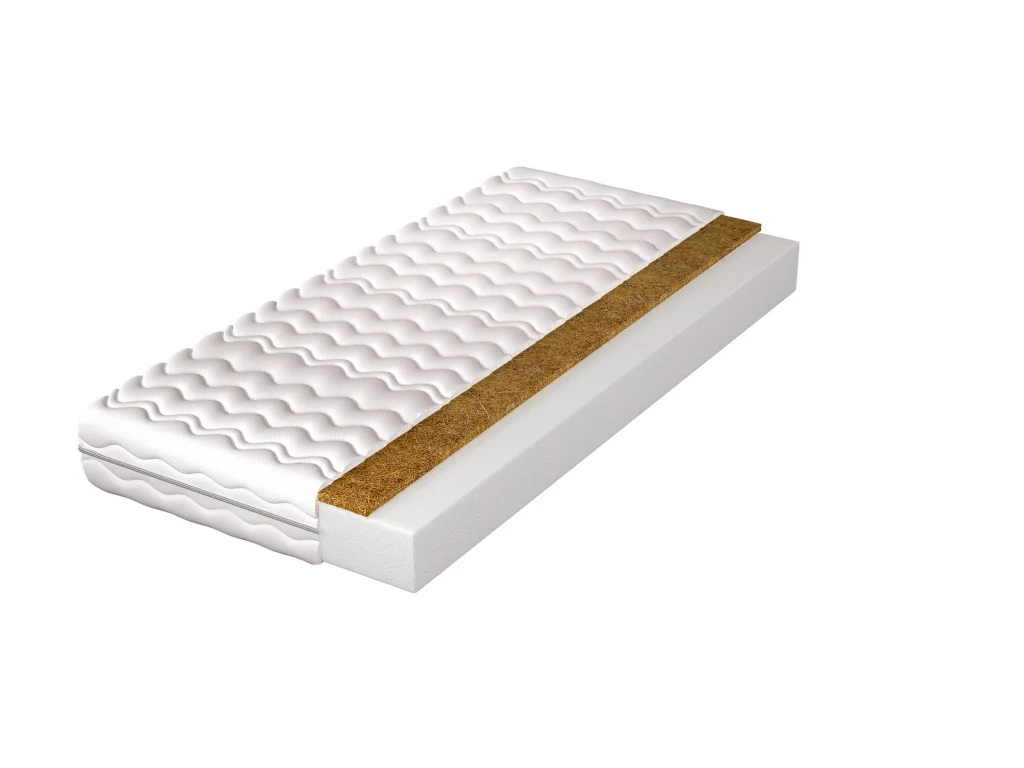 Hypoalergenní oboustranná pěnová matrace o rozměrech 120 × 200 cm nabízí komfortní spánek s výplní z pěny T25 o výšce 13 cm a na jedné straně 1 cm kokosové vrstvy pro lepší ventilaci a podporu.