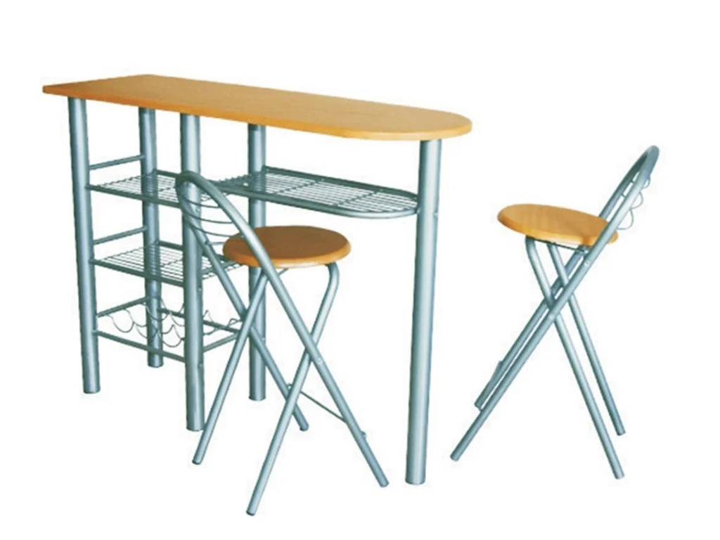 Barva je buk/šedá a povrchová úprava kombinuje MDF desku s kovovým rámem s aluminiumovým nátěrem, což působí moderně a odolně. Rozměry stolu jsou 120 × 40 × 88 cm, zatímco průměr židle činí 39 cm. Sedací výška je 59,9 cm, hloubka sedu 30 cm a výška židle 88 cm, nosnost každé židle dosahuje 100 kg. Dodání je v demontu a na výrobek se vztahuje záruka 24 měsíců. Praktický design a kompaktní rozměry umožní snadné umístění i do menších domovů, přičemž sestava poskytuje pohodlné posezení pro dvě osoby a jednoduchou organizaci nápojů a sklenic.