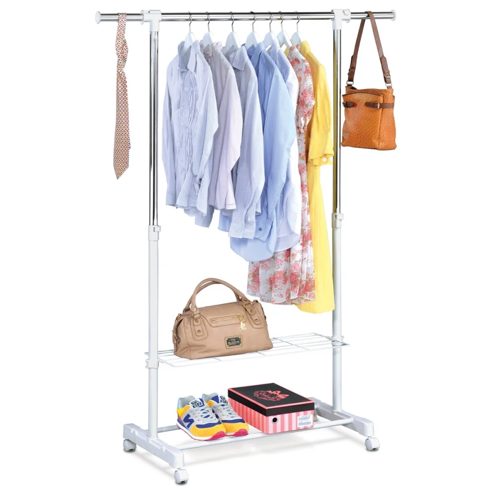 Praktický stojan na šaty s integrovaným odkladačem na boty a krabice, který usnadní pořádek v předsíni či šatně. Disponuje drátěnou policí, kterou lze nastavit do libovolné výšky, a tím snadno přizpůsobit délku oděvů i obuvi.