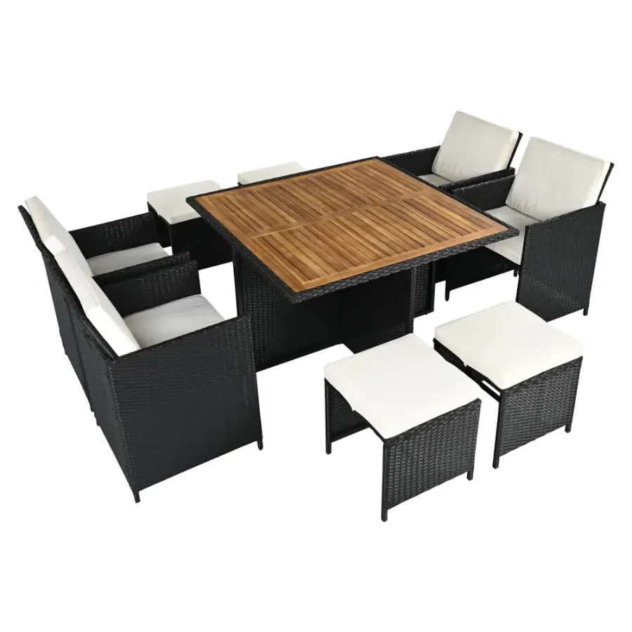 Rám je vyroben z odolné oceli a kombinace technického ratanu zajišťuje dlouhou životnost a snadnou údržbu. Deska stolu je z masivního akáciového dřeva a dodává soupravě přírodní vzhled. Polštáře disponují voděodolnými potahy, které lze snadno vyprat při 30 °C, a jsou tak vhodné pro venkovní použití. Rozměry: křeslo 53 x 58,7 x 86 cm; výška sedu s polštářem 50 cm (45 cm bez polštáře); šířka sedu 48 cm; taburet 41 x 41 x 40 cm; stůl 109 x 109 x 75 cm; nosnost na osobu 90 kg; tloušťka polštáře 5 cm. Dodáváno v demontu. Černá a krémová kombinace s přírodními prvky vytváří nadčasový vzhled, který skvěle zapadne do každé zahrady či terasy. Navíc díky praktickému ukládání pod stolem získáte více volného prostoru pro relaxaci a hosty.