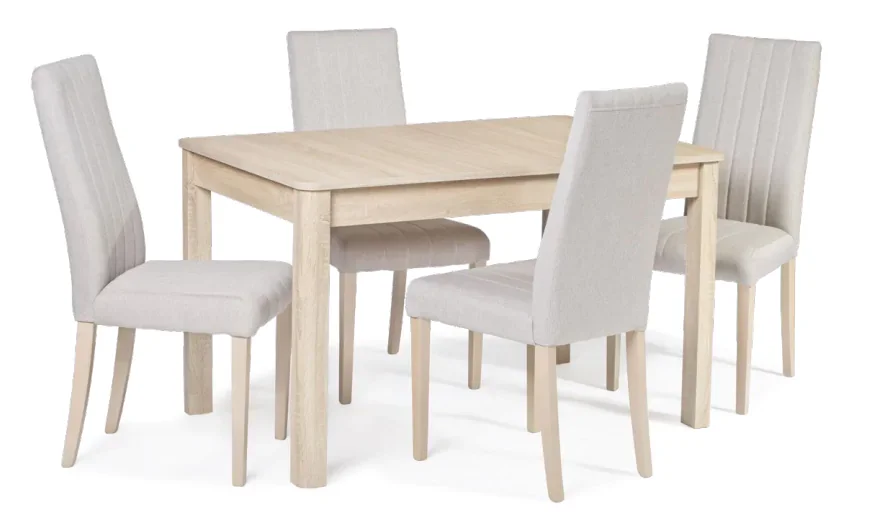 MIKO Rozkládací jídelní set kombinuje stůl HUGO s rozkládacím mechanismem a čtyři čalouněné židle DIEGO 3, které skvěle doplní moderní jídelnu či kuchyni. Sedáky židlí jsou zajištěny měkkým čalouněním pro vysoké pohodlí během jídel, dlouhých večerů i posezení s hosty. Stůl nabízí extra prostor díky integrovanému rozkladu, který plochu zvětší až o 50 cm a umožní pohodlné stolování pro více osob. K dispozici je několik odstínů dřeva pro desku a podnož, takže si vyberete vzhled, který nejlépe zapadne do vašeho interiéru. Rozměry stolu jsou 130 x 84 x 75 cm, rozšíření na 50 cm, deska lamino 18 mm a hrana ABS 1 mm; nohy z MDF o profilu 7 x 7 cm. Židle Diego 3 mají celkovou výšku 99 cm, sedací výšku 48 cm, šířku sedu 48 cm a hloubku sedu 43 cm; konstrukce je masiv buk a nosnost až 120 kg; čalounění tvoří látka ET15. Odstíny dřeva desky a podnože lze vybrat v konfiguraci níže a termín dodání se liší podle vybraného odstínu, což umožňuje plnou personalizaci. Tento set spojuje odolnost s elegantním vzhledem a komfortem, který oceníte při každé večeři.