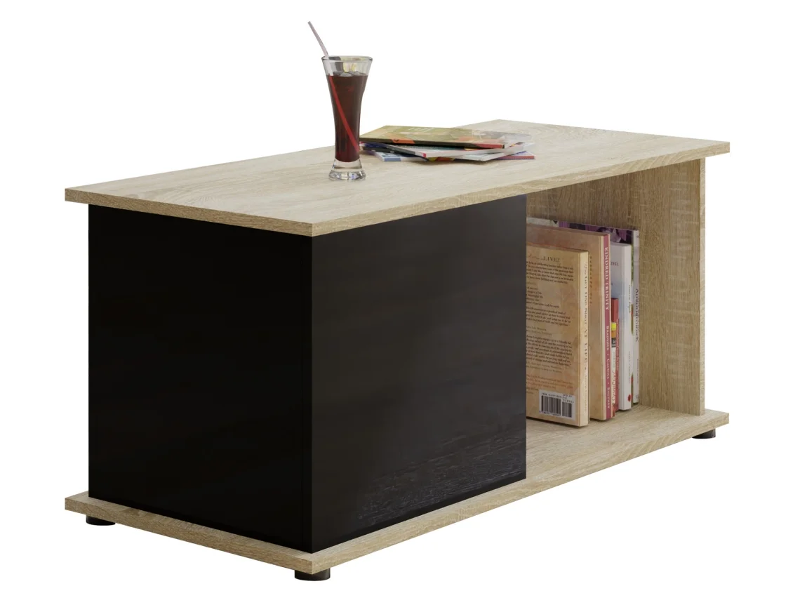 Konferenční stolek MIWA se vyznačuje kombinací dubu sonoma a černého detailu pro moderní vzhled obývacího pokoje. Rozměry: 50 × 53,8 × 120 cm (š × v × h) poskytují dostatek místa na odkládání i dekorace.