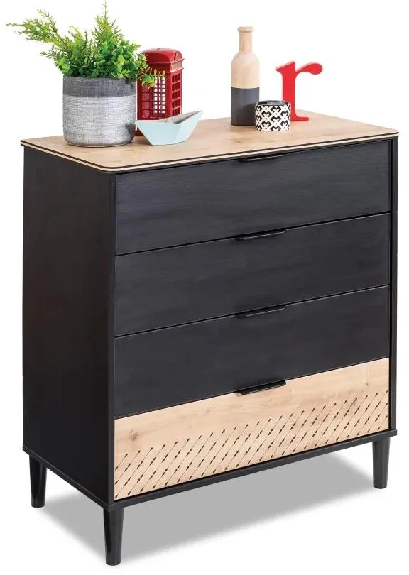 Kovové úchytky a vyšší nohy nejenže dodávají moderní vzhled, ale také usnadňují úklid. Čelní část spodní zásuvky je ozvláštněna dekorem dubu s laserem vypáleným šipkovým vzorem, což přidává na atraktivitě. Komoda je vybavena bezpečnostním kotevním lanem, ideálním pro ochranu menších dětí, a proto je vhodná do každé rodinné domácnosti. Tento praktický kus nábytku nejenže skvěle poslouží pro uložení oblečení, učebnic či výtvarných potřeb, ale také přispívá k modernímu vzhledu pokoje. Doporučujeme ji jako spolehlivého parťáka pro uspořádání vašeho dětského prostoru.