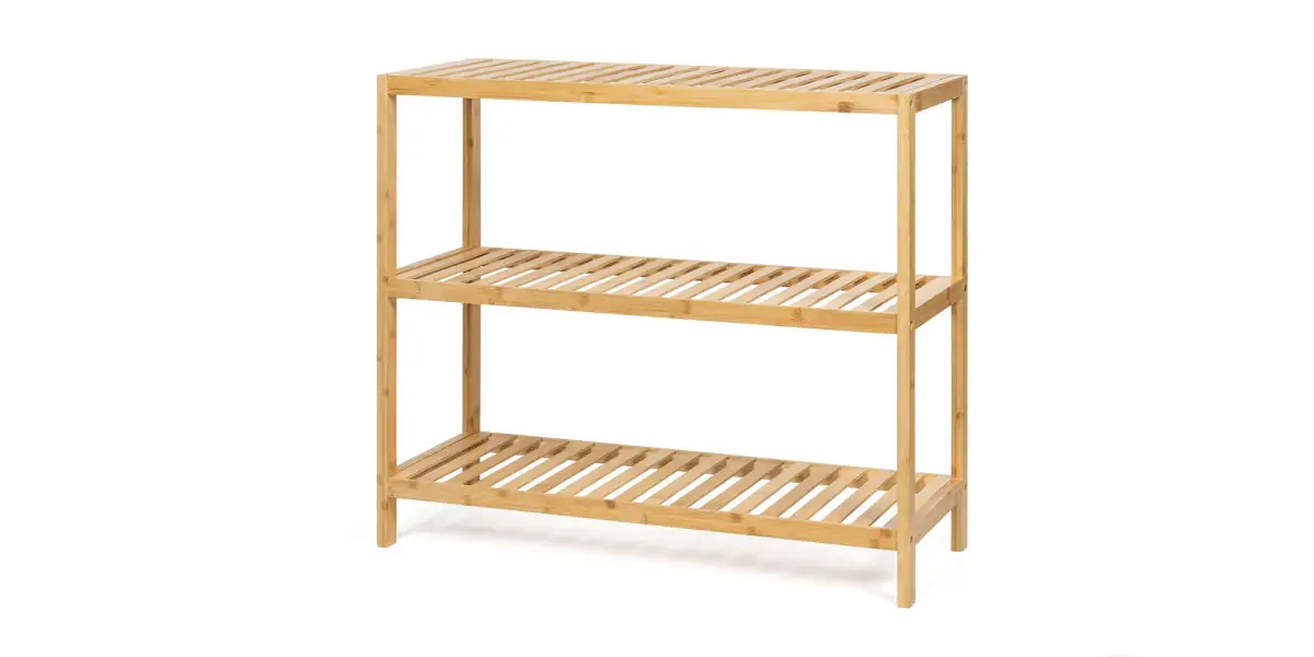 Minimalistický bambusový regál MONA s třemi prostornými policemi se hodí jako praktický botník i do dalších míst v domě. Otevřený lamelový design zajišťuje volnou cirkulaci vzduchu a minimalizuje usazování prachu. Regál je vyroben z odolného bambusu, který je pevný a dlouhodobě vydrží každodenní používání. Díky svému univerzálnímu provedení se skvěle hodí do koupelny, předsíně, kuchyně i obývacího prostoru a poskytuje dostatek místa pro ručníky, obuv, dekorace a drobnosti. Dodává se v demontu, montáž je jednoduchá a výsledek působí čistě a moderně. Přírodní vzhled bambusu dodá interiéru teplo a nadčasový šarm, zatímco konstrukce zajišťuje lehkost a snadnou manipulaci.
