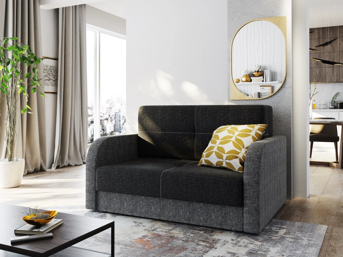 Univerzální pohovka s funkcí spánku a praktickým úložným prostorem pod sedákem. K dispozici jsou dvě potahové varianty: kornet 10 v černé látce s bílým prošíváním a kornet 02 v šedé látce s bílým a černým stehem.