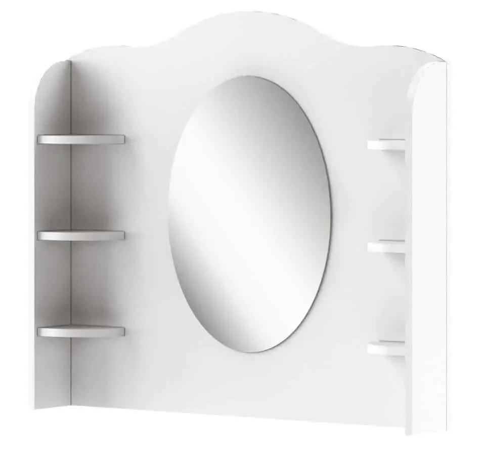 Nádstavec se zrcadlem ELISA MI-06 je praktický doplněk, který lze jednoduše umístit na pracovní stůl ze stejné série a vytvořit tak kompaktní soupravu do pokoje. V jeho středu naleznete oválné zrcadlo a po stranách tři poličky pro uspořádání kosmetiky a drobných předmětů.