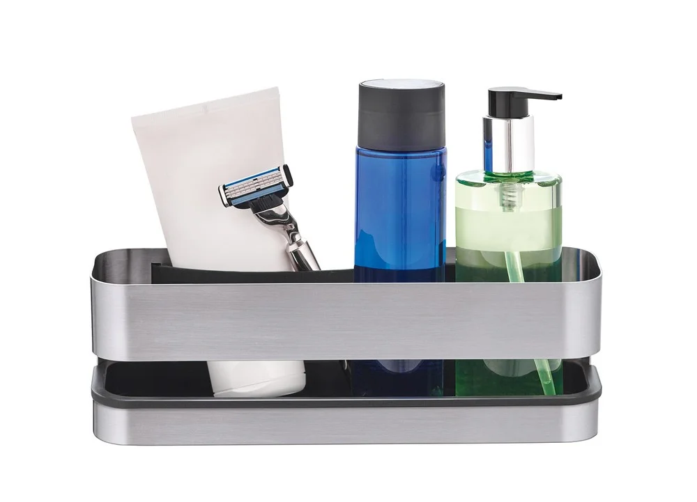 Nástěnná koupelnová polička NEXIO od Blomus kombinuje matnou nerezovou ocel s černými plastovými detaily a působí čistým, minimalistickým dojmem. Montáž je flexibilní: k dispozici je dodaná montážní sada, nebo ji lze bez vrtání připevnit pomocí lepící sady 2FIX, kterou u nás lze dokoupit. Dno poličky je protiskluzové a lze jej snadno vyjmout pro údržbu.