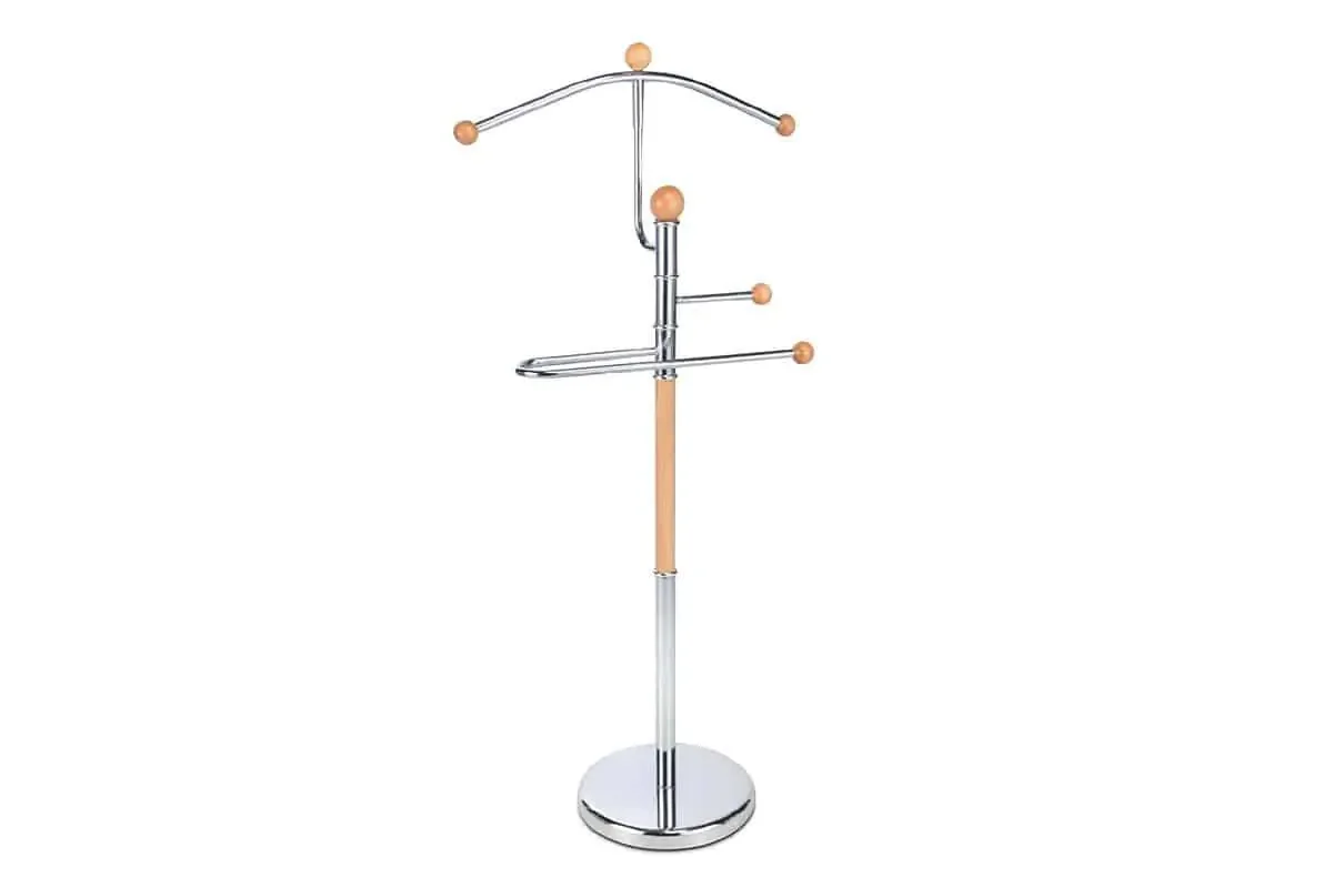 Němý sluha je praktickým pomocníkem nejen v ložnici, ale i v šatně či koupelně. Je vyroben z kombinace chromu a bukového dřeva, což mu dodává elegantní a nadčasový vzhled. Tři držáky mají otočné prvky, díky nimž lze každý z držáků volně otáčet do různých směrů podle potřeby. Dodáváno v demontu. Díky kompaktním rozměrům a jednoduché montáži pomáhá udržet pořádek a zrychluje každodenní rutinu, zatímco robustní konstrukce zaručuje dlouhou životnost.