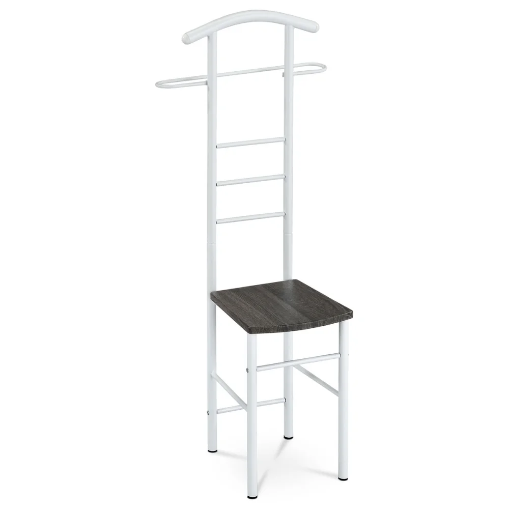 Moderní a praktický němý sluha se sedátkem, jehož nosnost dosahuje až 80 kg. Kovová konstrukce s matnou bílou povrchovou úpravou působí stylově a zaručuje dlouhou životnost. Rozměry 50 × 41 × 119 cm poskytují pohodlnou výšku pro bezproblémové používání a stabilitu. Dodáváme v demontovaném stavu a na výrobek se vztahuje záruka 24 měsíců. Tento doplněk se hodí do kuchyně, šatny i dílny a svým nadčasovým designem nabídne praktickou službu dlouhá léta.
