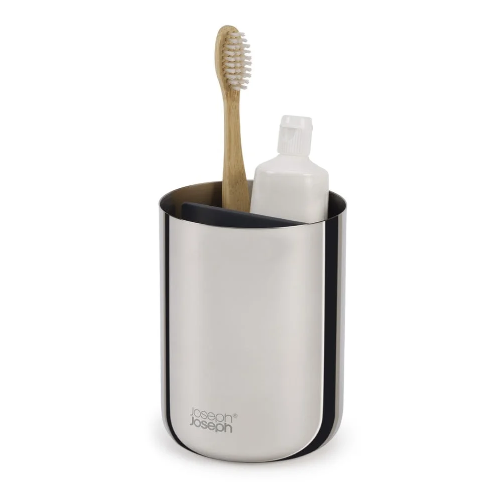 Elegantní nerezový držák na zubní kartáčky od značky Joseph Joseph je ideální volbou pro organizovanou koupelnu. Díky třem odděleným sekcím nabízí přehledné a hygienické uspořádání klasických i elektrických kartáčků spolu s pastou.