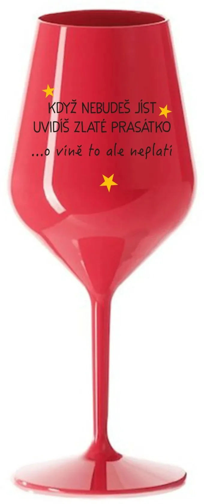Stylová a odolná sklenice na víno s motivem KDYŽ NEBUDEŠ JÍST, UVIDÍŠ ZLATÉ PRASÁTKO je ideální pro venkovní radovánky, odpolední relax na zahradě nebo na dovolené. Vyrobena z kvalitního polykarbonátu, je téměř nerozbitná a odolná vůči nárazům, což ji činí perfektní volbou pro cestování, pikniky nebo kempování.