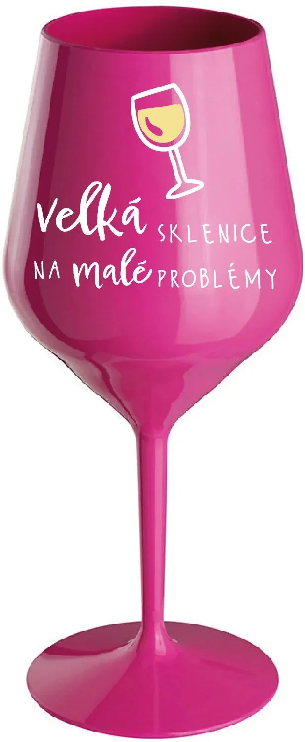 Stylová a odolná růžová sklenice na víno s motivem Velká sklenice na malé problémy je ideální společník na zahradu, pláž, výlety či pikniky. Vyrobena z kvalitního polykarbonátu, je téměř nerozbitná a odolná vůči nárazům, což ji činí perfektní pro venkovní použití.