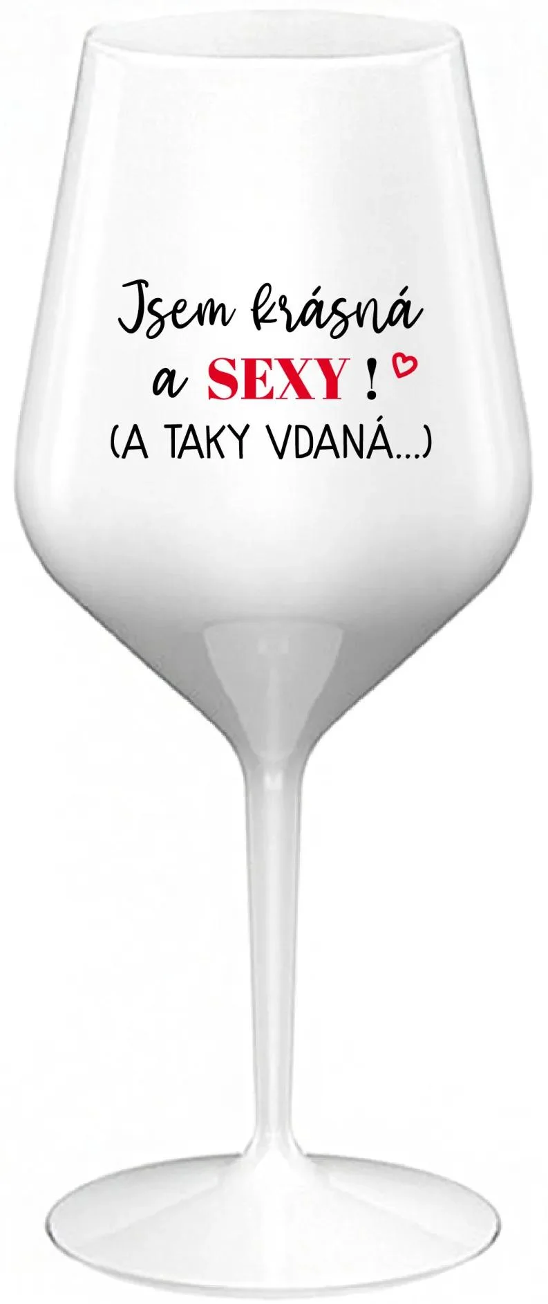 Moderní design s motivem „JSEM KRÁSNÁ A SEXY! (A TAKY VDANÁ...)“ dodá vaší akci šmrnc a osobitost. Ergonomický tvar padne příjemně do ruky a nízká hmotnost usnadňuje přenášení. Sklenice je snadno skladovatelná a jednoduchá na čištění, což z ní činí praktický doplněk pro každého milovníka vína, který rád cestuje a užívá si chvíle s kvalitním nápojem kdekoliv. Dopřejte si komfort a styl při každém doušku!