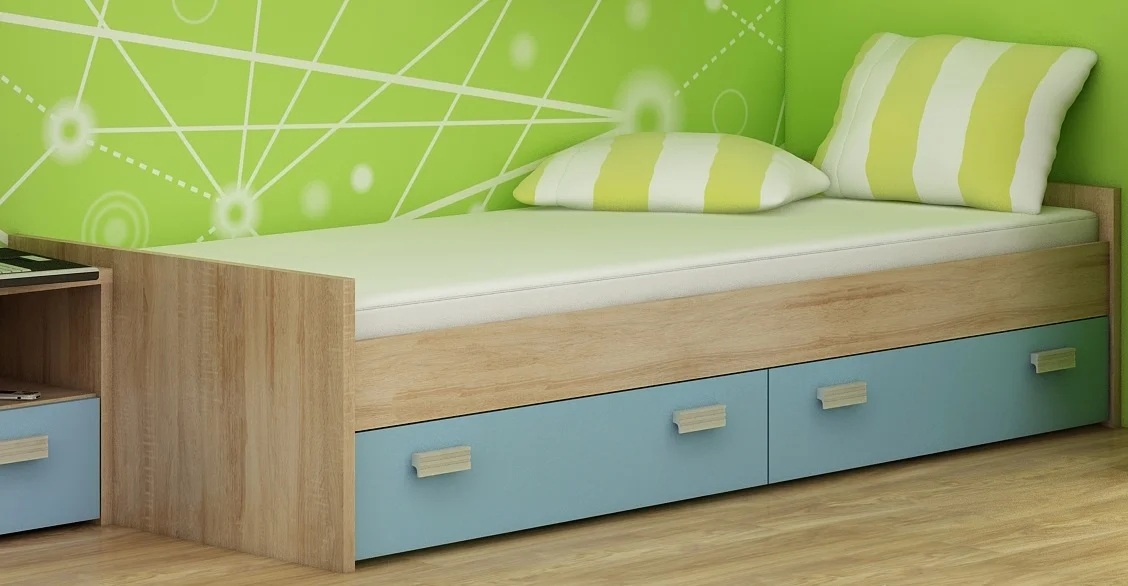 Nízká postel NELLORE v dekoru dub sonoma s jemným modrým akcentem přináší do ložnice moderní vzhled. Korpus je z lamina tloušťky 25 mm, dvířka 16 mm a ABS hrana 0,6 mm zajišťují dlouhou životnost a snadnou údržbu.
