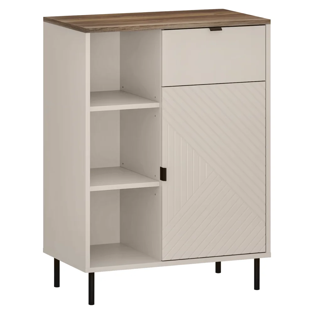 Rozměry (š x h x v): 70 × 40 × 95 cm. Tloušťka materiálu činí 1,6 cm. Regál má jedny dvířka, jednu skříňku a jednu zásuvku, doplněné otevřeným úložným prostorem a policí. Uchytné prvky jsou kovové, barva úchytek černá, nožičky také kovové a černé, výška nožiček 12 cm. Nosnost vrchní desky až 30 kg; police a zásuvka unesou 5 kg. Dekorativní dvířka a moderní design dodávají kousku šmrnc; doporučujeme pevné ukotvení ke zdi pro větší stabilitu. Regál se dodává v demontu. Elegantní a praktické řešení pro ukládání věcí, které zaujme v obývacím pokoji i pracovnách a efektivně pomůže s organizací prostoru.