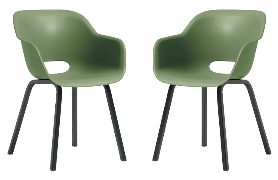 Dvojice křesel z lisovaného plastu a kovových prvků nabízí pevný a stylový design pro moderní i retro interiéry i venkovní použití. Díky svému provedení poskytují pohodlí pro dlouhé sezení a jejich snadná údržba je zárukou bezstarostného používání – stačí vlhký hadřík s kapkou čisticího prostředku. Rozměry: sed 40 cm hluboký, opěrka 39 cm vysoká, sed 35 cm široký, výška područek 65 cm, tloušťka područek 1,5 cm, výška nohou 43 cm. Dodáváno v demontu pro snadnou přepravu. Rozměr balení 60 x 69 x 41 cm, v balení jsou 2 kusy.