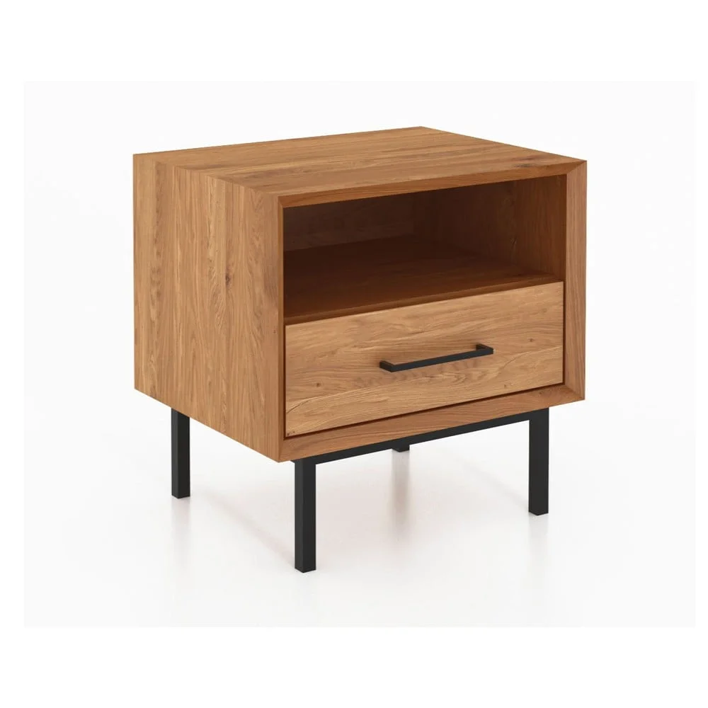 Objevte Noční stolek Abies, který přináší do vaší ložnice jedinečný mix moderního a rustikálního stylu. Vyrobený z kvalitního dubového dřeva s kovovými nohami v elegantní černé barvě, tento kus nabízí pevnou a stylovou konstrukci.