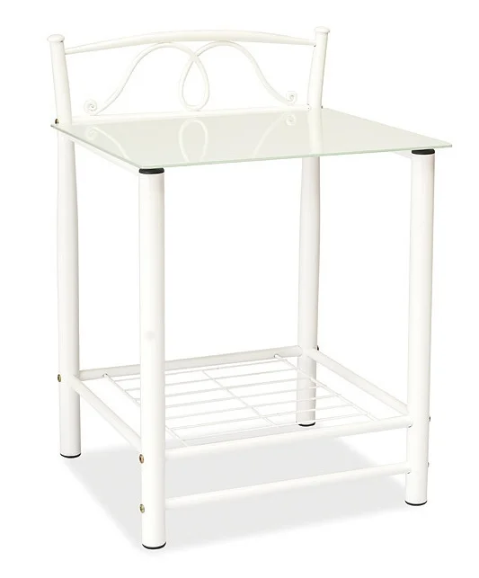 Stylový noční stolek s čistými liniemi a minimalistickým vzhledem. Kovová konstrukce v bílé barvě doplňuje vrchní desku z tvrzeného mléčného skla, která působí elegantně a odolně. Uložení drobností usnadňuje praktická odkládací polička.