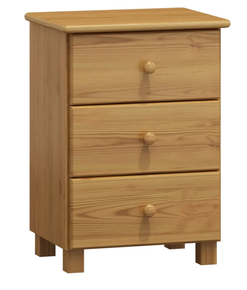 Praktický noční stolek FEIJOA 3 nabízí třemi šuplíky, do nichž pohodlně schováte knížky, brýle i drobnosti. Je vyroben z masivu borovice a má moření v odstínu olše, které dodá nábytku teplý vzhled.