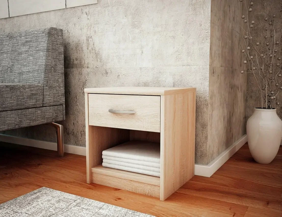 Moderní noční stolek s jemně propracovanými liniemi a pevnou konstrukcí z LTD. Korpus i dvířka jsou potaženy lamino v barvě dub sonoma, která zaručuje snadnou údržbu a dlouhou životnost. Lamino je odolné vůči teplotním výkyvům, poškrábání a nárazům, přičemž hrany jsou zakončeny ABS páskou pro vyšší ochranu proti opotřebení. Stolek obsahuje jednu praktickou zásuvku pro uschování drobných věcí. Viditelná struktura dřeva dodává nábytku přírodní a vkusný vzhled. Dodáváme v demontovaném stavu se základním návodem k montáži, montáž zvládne každý během několika minut. Díky neutrálnímu provedení se skvěle hodí do různých ložnic i obývacích pokojů a praktická zásuvka pomůže udržet pořádek.