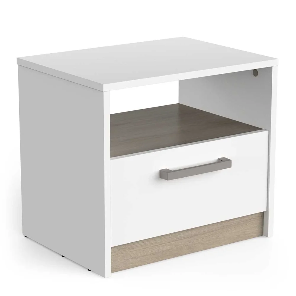 Praktický noční stolek s zásuvkou a policí poskytuje pohodlné a přehledné úložné místo vedle postele. Kombinace bílé barvy s dubovým dekorem Kronberg vnáší do interiéru svěží, nadčasový vzhled.