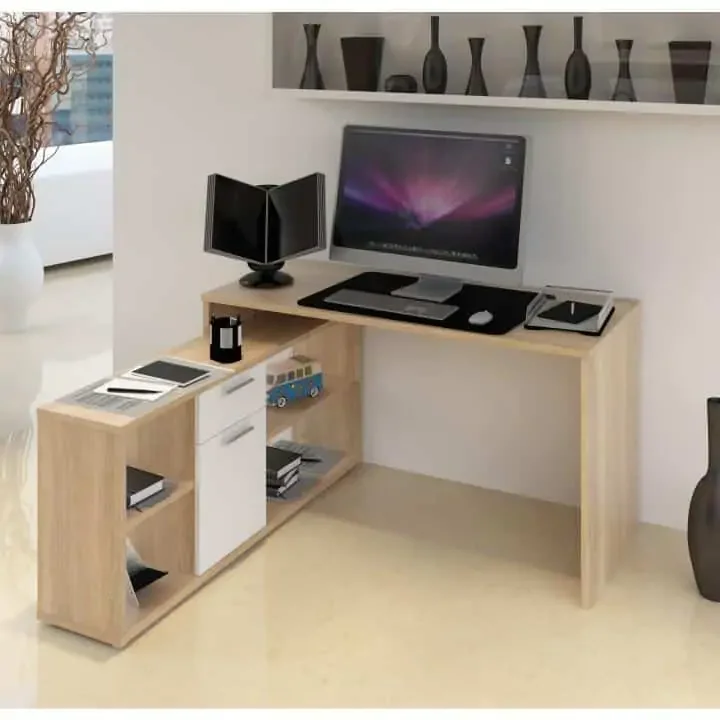 Rohový PC stůl NOE NEW je vyrobený z fóliované dřevotřískové desky v kombinaci dub sonoma a bílé, která dodává moderní vzhled a dlouhou životnost. Součástí stolku je praktický regál, zásuvka a skříňka pro snadné ukládání pomůcek.