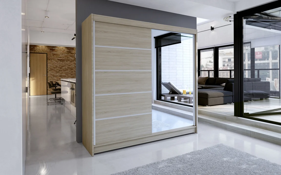 Šatní skříň se zrcadlem v provedení dub sonoma kombinuje praktické uspořádání s moderním vzhledem. Rozměry 180 cm na šířku, 58 cm na hloubku a 215 cm na výšku poskytují dostatek místa pro oděvy i doplňky. Konstrukce z laminované desky o tloušťce 16 mm s ABS hranami zaručuje odolnost a snadnou údržbu. Dveře jsou vedené hliníkovými kolejnicemi Sevroll, které zajišťují tichý a plynulý chod. Úchyty ve formě hliníkové lišty dodávají dveřím stabilitu a zabraňují prohnutí. Poznámka: vnitřní uspořádání na obrázku je ilustrační a skutečné odstíny se mohou lišit. Dodáváno v demontu pro snadnou dopravu a montáž.