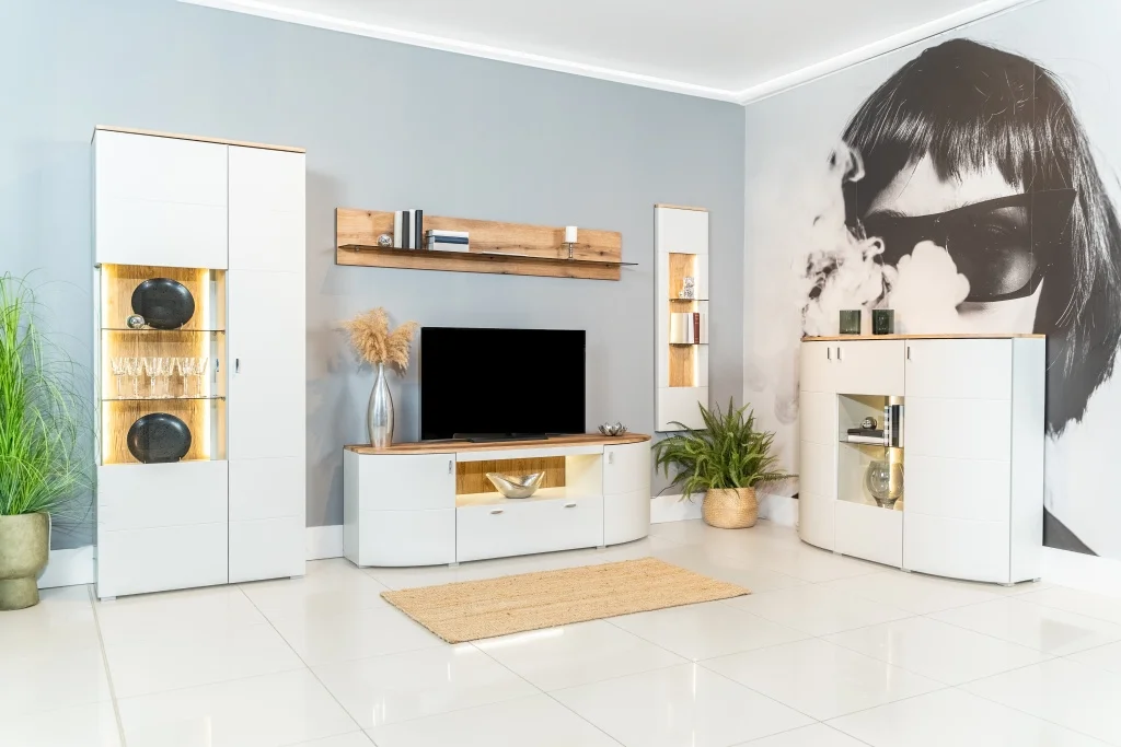 S rozměry (š × v × h cm): vitrína 2D – 90 × 207 × 37; TV komoda 2D1S – 180 × 61 × 44; police – 180 × 30 × 22; závěsný panel – 41 × 146 × 26; komoda 3D – 135 × 119 × 44. Barva: dub coast evoke / světlá šedá. Materiál: lamino a sklo. LED osvětlení není součástí jednotlivých prvků. Dodáváno v demontu. Modulární systém umožňuje prostor jednoduše upravit podle potřeby, ať už jde o menší obývací zónu nebo rozšíření s dalšími komponenty. Navíc nadčasový kontrast světlého šedého odstínu a teplého dřeva dodává interiéru moderní vzhled a snadnou údržbu.