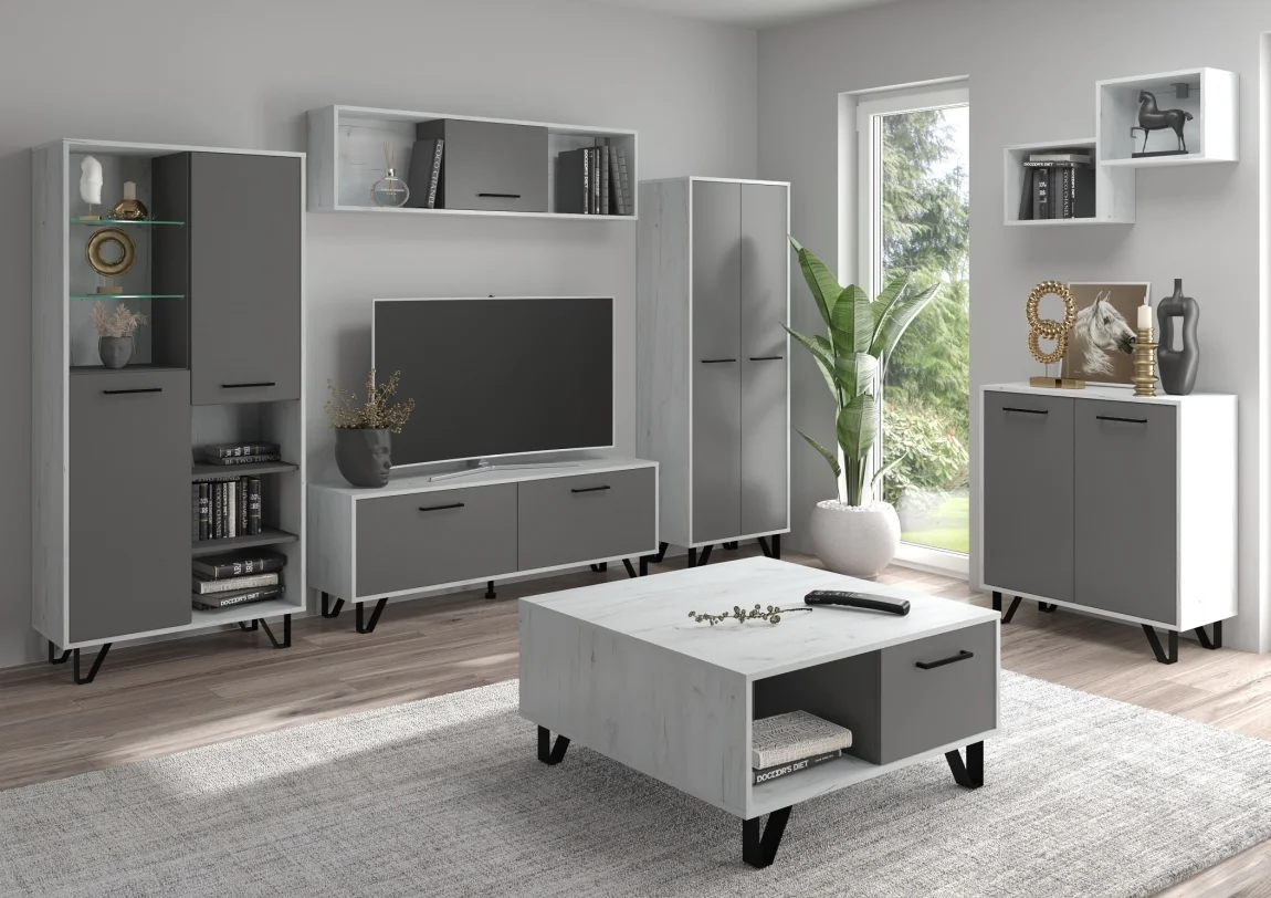 Ilustrativní konfigurace obývacího pokoje PRUDHOE 1 v provedení craft bílá/grafit umožňuje variabilní uspořádání podle prostoru i vkusu. Každý díl lze pořídit samostatně, takže si sestavu snadno uzpůsobíte.
