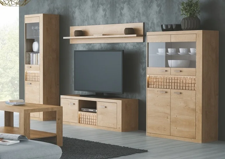 Toto obývací vybavení patří do moderní sektorové řady PULCHERIA, která spojuje styl s praktičností pro váš obývací pokoj. Sestava zahrnuje vysokou vitrínu (57 × 47,5 × 200,5 cm), nižší vitrínu (102 × 40,5 × 159,5 cm), телевизní stolek (150,5 × 40,5 × 51 cm) a polici (120 × 18 × 32 cm).