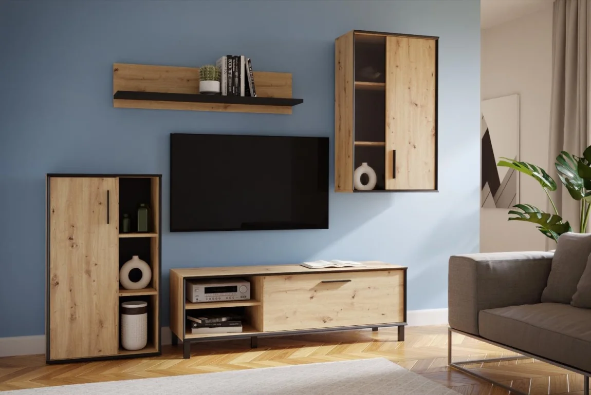 Materiál je lamino s odolným povrchem, který se snadno udržuje a zaručuje dlouhou životnost. Černé plastové úchyty ladí s celkovým designem a podtrhují moderní linie nábytku. Dodáváno v demontu, montáž je rychlá a zvládne ji každý. Na výrobek se vztahuje pětiletá záruka, která vám poskytne klid při investici. Pro čistý a nenápadný vzhled je tato stěna vhodná pro středně velké i prostornější obývací pokoje.