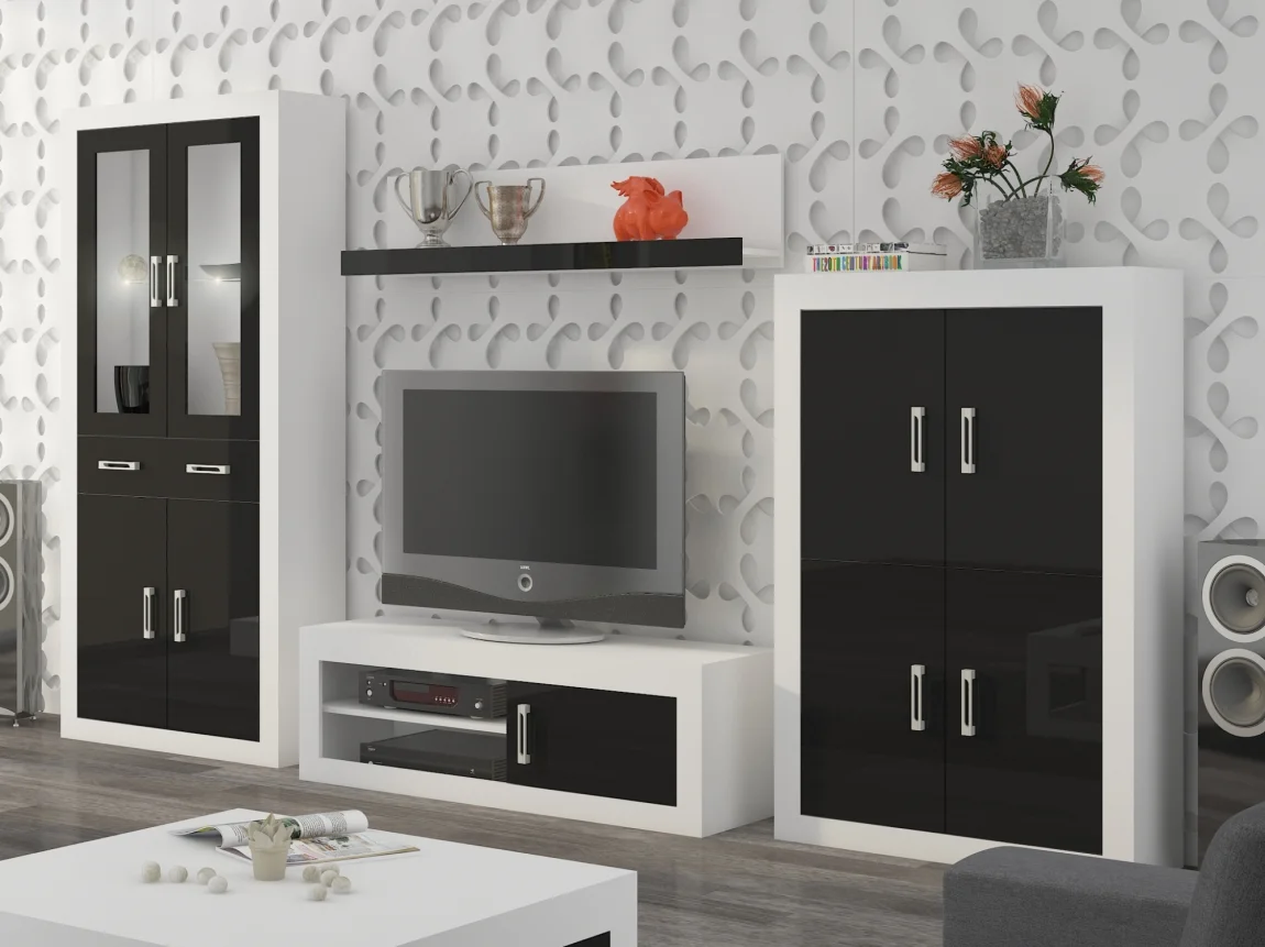 Obývací stěna GOUDINI 10 v provedení bílá s černým leskem přináší elegantní vzhled a praktické řešení pro váš obývací prostor. Vyrobena je z lamina o tloušťce 16 mm, což zajišťuje odolnost a snadnou údržbu.
