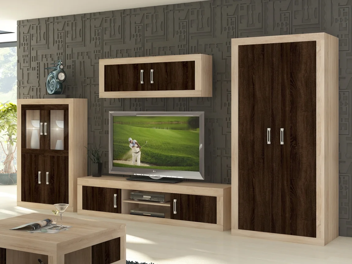 Obývací stěna GOUDINI 9 kombinuje světlý dub sonoma s tmavším odstínem pro moderní vzhled. Pro výrobu byl zvolen materiál lamino 16 mm, který zaručuje dlouhou životnost a snadnou údržbu. Součástí sestavy jsou závěsná skříňka (130 x 46 x 34 cm), skříň (90 x 198 x 60 cm), regál (90 x 141 x 34 cm) a RTV stolek (180 x 44 x 44 cm). Stříbrné úchytky zásuvek a dvířek jsou vyrobeny z tvrzeného PVC a dotvářejí moderní vzhled. Dodává se v demontu a na výrobek je poskytována záruka 5 let. Díky promyšlené konfiguraci nabídne dostatek úložného prostoru pro multimediální zařízení, knihy i dekorace a snadno se přizpůsobí různým velikostem obývacích pokojů.