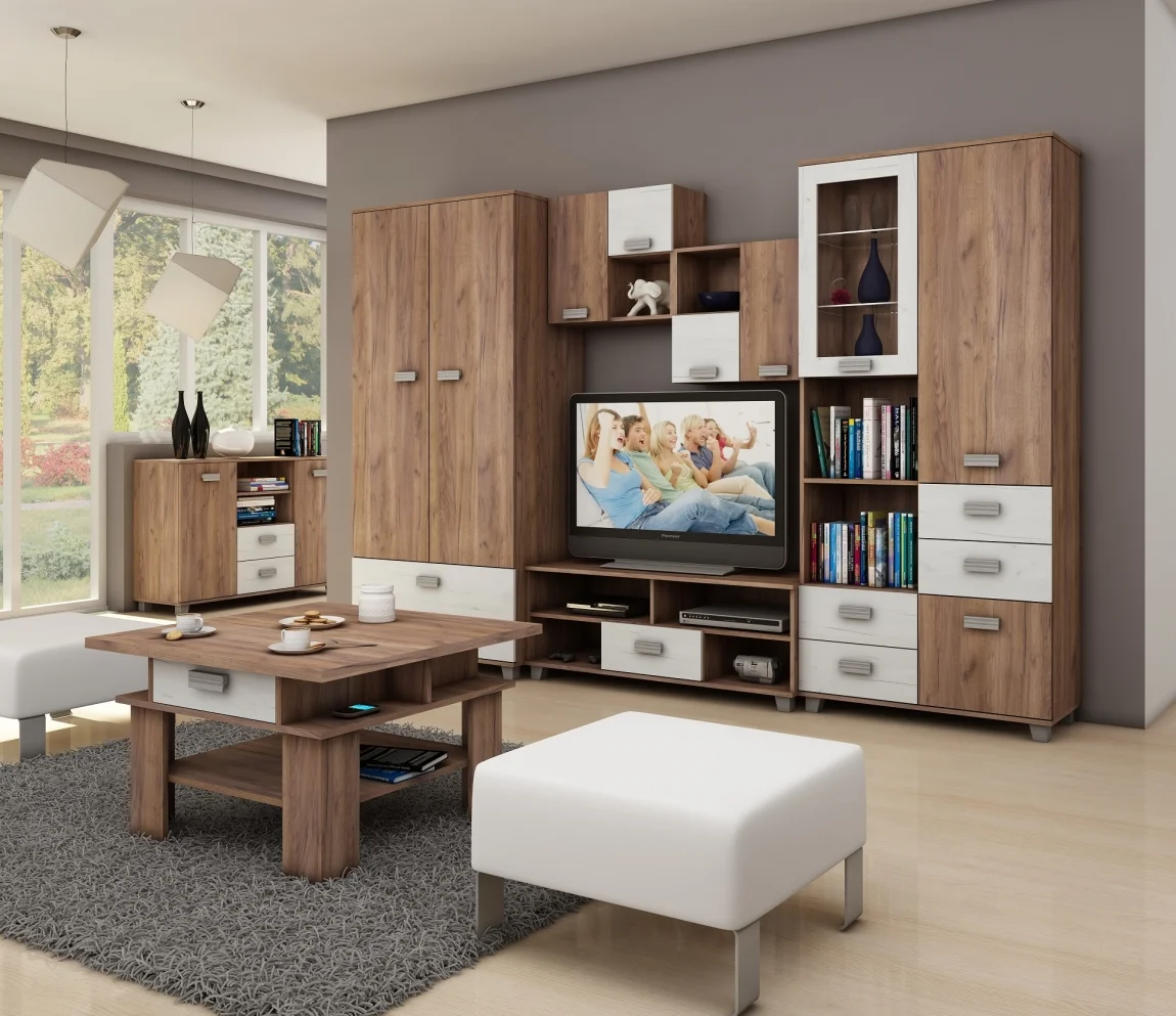 Sestava obsahuje regál 90 × 200 × 42 cm, RTV stolek 120 × 47 × 47 cm, skříň 80 × 200 × 54 cm a dvě závěsné skříňky 60 × 53 × 31 cm. Komoda a konferenční stolek nejsou součástí balení. Dodává se v demontu. Záruka na celý set je 5 let. Pevný korpus a kvalitní povrch lamina zajišťují dlouhou životnost a snadnou údržbu. Díky modulárnímu rozvržení lze nábytek snadno přizpůsobit prostoru a vytvořit praktické úložné řešení.