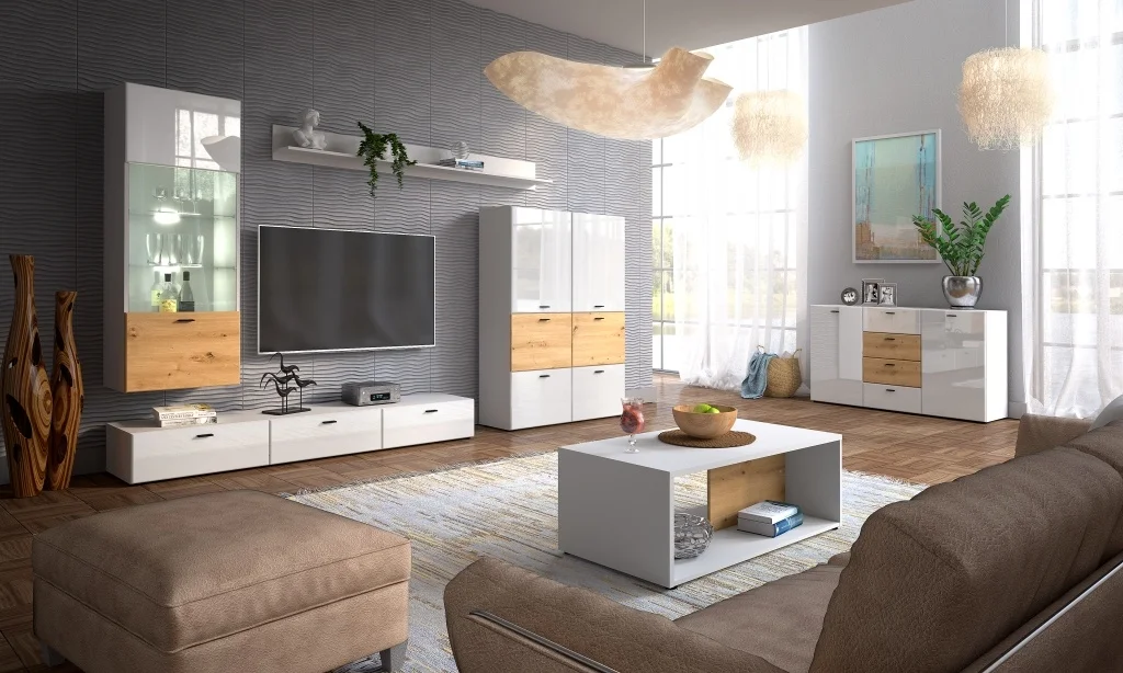 Obývací stěna LUCENCE kombinuje moderní vzhled s praktickou dispozicí pro váš obývací prostor. LED osvětlení dodává místnosti atmosféru a podtrhuje vzhled při sledování televize. Korpus je matný bílý a dvířka tvoří kombinace bílé lesklé plochy s dubem Artisan, doplněné černými úchyty.
