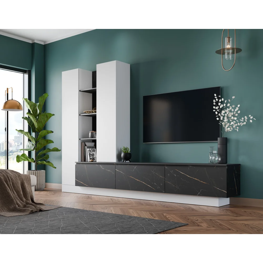 Nosnost jednotlivých prvků: police až 5 kg, spodní deska skříňky 10 kg a vrchní deska TV stolku 25 kg. V sadě najdete police, TV skříňku a skříňky pro praktické uspořádání věcí. Dvířka disponují tlumeným zavíráním dvířek a pohybují se tiše díky plastovým kluzákům v černé barvě. Design je moderní a nadčasový, vhodný pro většinu obývacích pokojů. LED osvětlení není součástí balení; doporučujeme pořídit LED osvětlení z naší nabídky pro lepší atmosféru. Z bezpečnostních důvodů doporučujeme připevnit stěnu ke zdi. Dodáváno v demontu, s návodem k rychlé montáži.