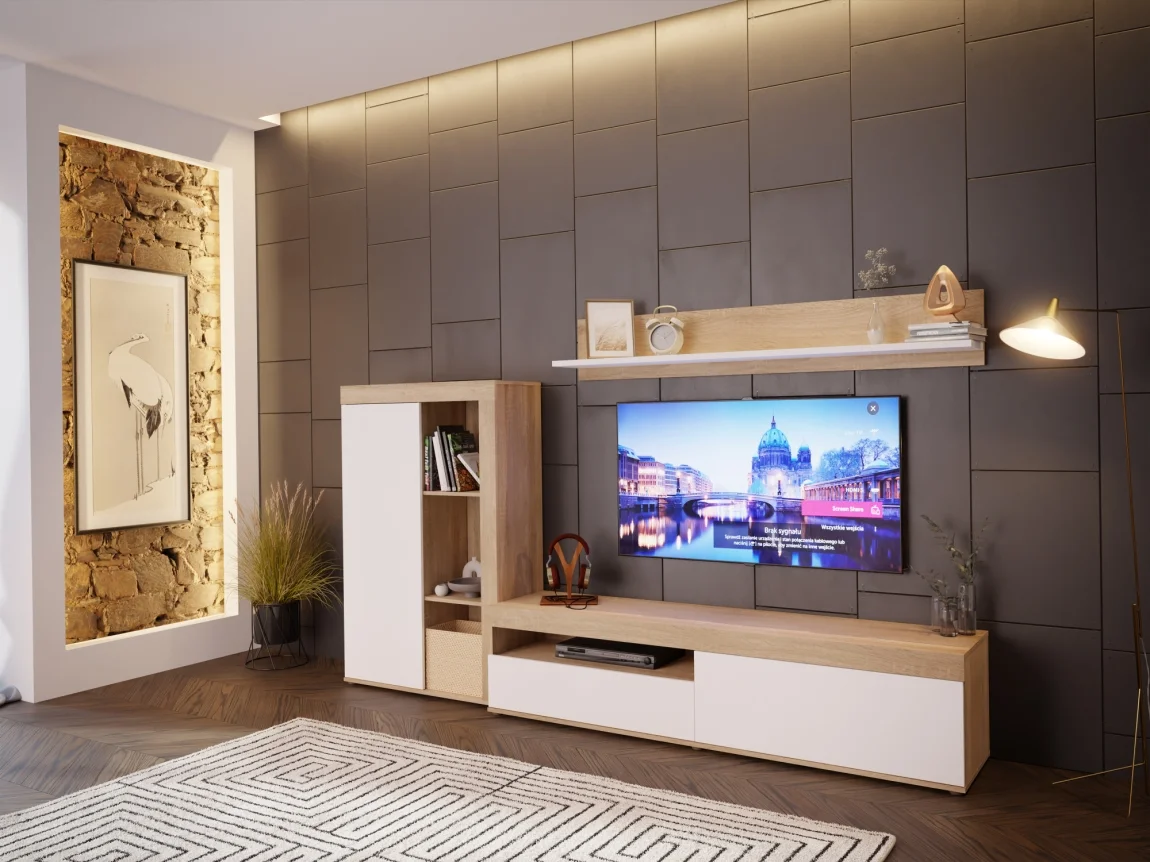 Obývací stěna NOKO kombinuje dub sonoma a bílá pro moderní vzhled, který se hodí do každého interiéru. Je vyrobena z odolného lamina a snadno se udržuje, takže skvrny stačí setřít. Rozměry 265 cm na šířku, 158,5 cm na výšku a 41 cm na hloubku poskytují dostatek místa pro televizi, knihy a dekorace. Dodáváno v demontu, což usnadňuje přepravu a montáž u vás doma. Díky praktickým přihrádkám a policím si snadno uspořádáte obsah a stěnu přizpůsobíte prostoru.